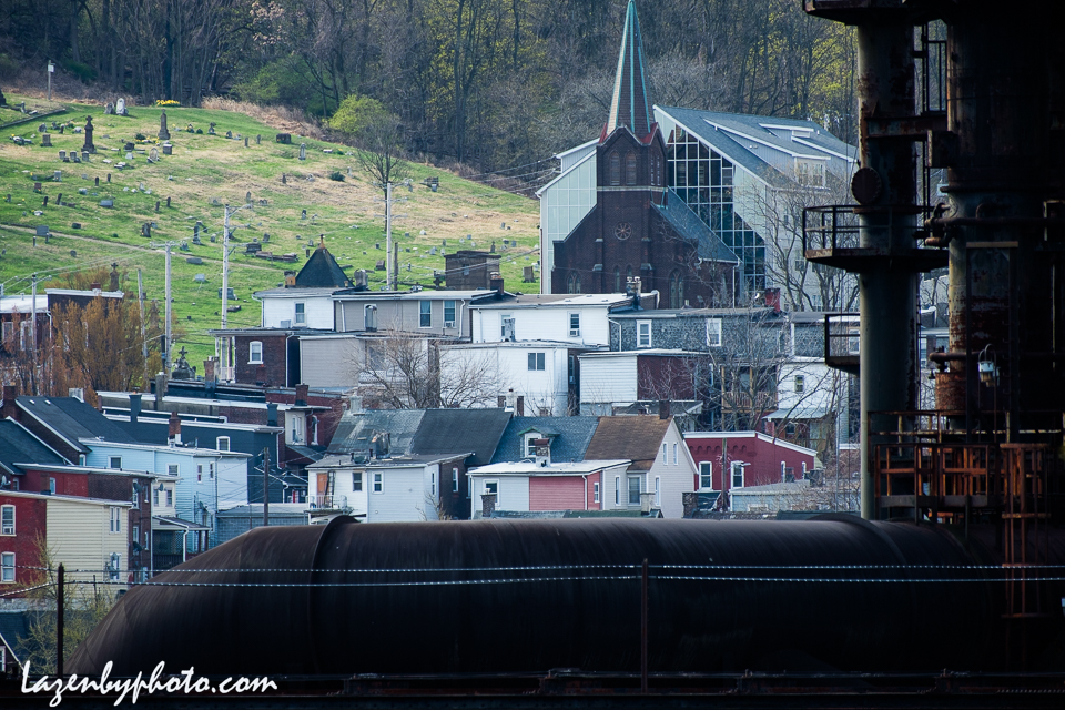 Abandoned Bethlehem Steel blast furnaces, Bethlehem Steel plant, South Bethlehem, PA., with South Bethlehem houses and cemetery, viewed from Bethlehem, PA.