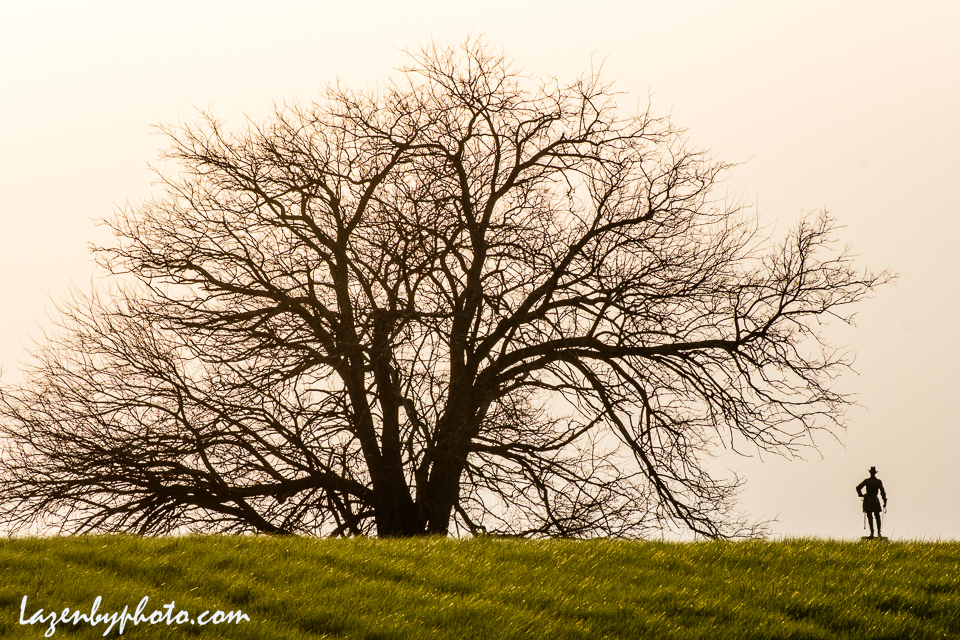 Soldier statue, tree, spring at Gettysburg, PA, battlefield, Gettysburg National Military Park.